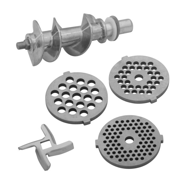 Сама насадка-мясорубка выполнена полностью из металла и укомплектована 5 насадки для различных целей: 3 решетки для изготовления фарша разного диаметра, а также специальные насадки для колбас и кеббе.