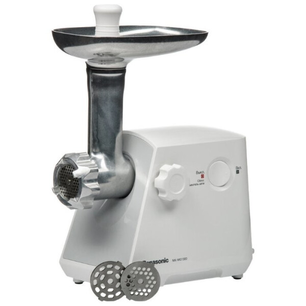 Компактная и недорогая мясорубка PANASONIC MK-MG1300 – одна из популярнейших моделей в своей ценовой категории. Главным ее достоинством являются высокое качество и надежность всех деталей. Хочется отметить, что хвостовик шнека – стальной, в то время как в большинстве недорогих моделей используются пластиковые втулки, которые довольно часто лопаются или стираются. Кожух механической части полностью изготовлен из металла, и только корпус – пластиковый. Комплектация мясорубки PANASONIC MK-MG1300 – стандартная. Помимо головки и винта, в нее входят очень прочный самозатачивающийся нержавеющий нож, три перфорированных диска и накидная гайка для их крепления, лоток для подачи продуктов из металла и пластиковый толкатель. Также эта модель отличается от аналогов более тихой работой при вполне солидной производительности.