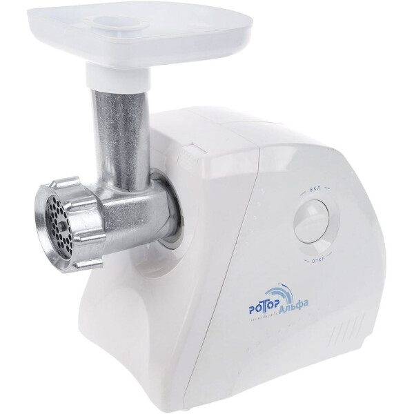 Электрическая мясорубка Ротор Альфа предназначена для приготовления мясного и рыбного фарша. Помимо этого на данной модели можно натереть, нашинковать или тонко нарезать овощи, фрукты и сыр. Тип мясорубки – шнековый, возможна комплектация разными насадками (приставка-мясорубка, приставка-овощерезка, насадка-соковыжималка). Корпус мясорубки и приемного лотка для продуктов изготовлены из прочного пластика белого цвета, на нижней части корпуса расположены прорезиненные ножки для дополнительной устойчивости.