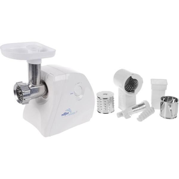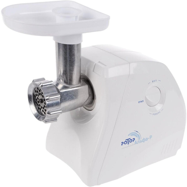 Электрическая мясорубка Ротор Альфа-Р поможет приготовить мясной и рыбный фарш, а также натереть, нашинковать или тонко нарезать овощи, фрукты и сыр. Тип мясорубки – шнековый. Мясорубку можно использовать как соковыжималку для ягод, мягких фруктов и овощей. Данная модель снабжена функцией "реверс": кратковременно меняется направление вращения шнека приставки-мясорубки. Корпус мясорубки и приемного лотка для продуктов изготовлены из прочного пластика белого цвета, на нижней части корпуса расположены прорезиненные ножки для дополнительной устойчивости.