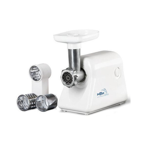 Мясорубка электрическая РОТОР ДИВА-Р ЭМШ 35/300-4 (дополнительная насадка - малая овощерезка, с функцией реверса предназначена для приготовления мясного или рыбного фарша. Электромясорубка поможет натереть, нашинковать или тонко нарезать овощи, фрукты и сыр. Данная модель снабжена функцией РЕВЕРС: для предотвращения уплотнения продуктов внутри мясорубки предусмотрен режим обратного вращения шнека. Тип мясорубки – шнековый. Напряжение питания 220 В, потребляемая мощность 300 Вт, производительность при приготовлении фарша не менее 35 кг/час, максимальная мощность 1500 В, режим работы - продолжительный, масса 2.6 кг, габаритные размеры 285х162х221 мм., Корпус мясорубки и приемного лотка для продуктов изготовлены из прочного пластика белого цвета, на нижней части корпуса расположены прорезиненные ножки для дополнительной устойчивости.
