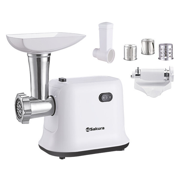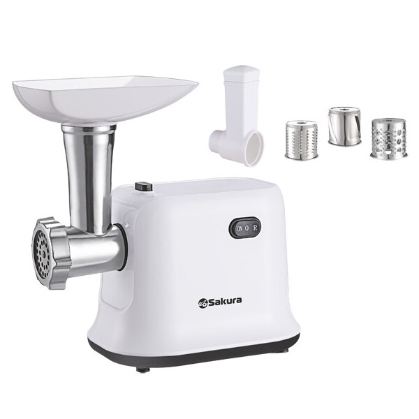 Мясорубка электрическая, 1500 Вт, функция реверс, корпус из эко-пластика, пластиковый лоток для продуктов и толкатель, металлический шнек, нож из нержавеющей стали, металл диск для измельчения (5 мм), отключение при перегреве.