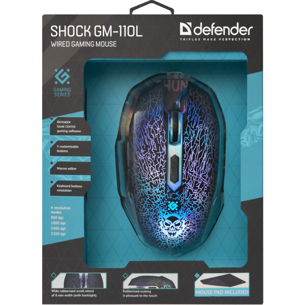 Компьютерная игровая мышь Defender Shock GM-110L 52110 работает на программном обеспечении Defender Game Center, имеет редактор макросов и эмуляцию клавиш клавиатуры. 4 режима разрешения мыши и кнопка переключения dpi позволяет выбрать скорость перемещения курсора (800/1800/2400/3200 dpi). Выбранный уровень скорости курсора отображается разной интенсивностью подсветки колеса прокрутки.