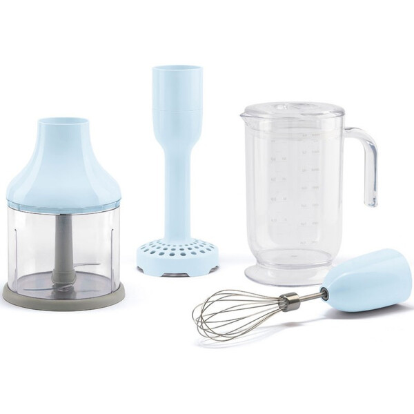 Набор аксессуаров HBAC01PB для погружного блендера HBF01PBEU выполнен в пастельном голубом цвете. В комплекте — венчик, насадка-измельчитель, пресс для картофельного пюре, мерная чаша с крышкой и ручкой.