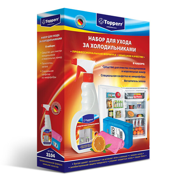 Набор Topperr 3104, состоящий из трех компонентов, сделает процедуру мытья холодильника более приятной, а главное эффективной. Средство для очистки активно воздействует на глубокие следы от жира, остатков пищи или грязи. Удалить их можно с поверхности бытовой техники при помощи специальной салфетки из микрофибры.