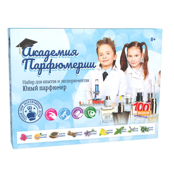 Набор для опытов и экспериментов «Юный парфюмер» даст вам и вашему ребенку уникальную возможность почувствовать себя правителями царства запахов и создать самый лучший аромат. Набор представляет собой настоящую большую лабораторию, с которой можно изучить историю парфюмерии, и создать собственные шедевры.