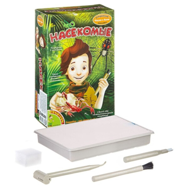 С помощью этого обучающего набора юный учёный-палеонтолог сможет извлечь фигурки ископаемых насекомых - паука, сверчка, скорпиона и муравья. В этом ему помогут настоящие инструменты палеонтолога! Ребенку предстоит аккуратно откалывать небольшие части в блоке для раскопок. Нужно приложить немного терпения, чтобы обнаружить скрытых внутри ископаемых! Набор наглядно продемонстрирует, как именно проводятся палеонтологические раскопки, а красочная инструкция расскажет много новых и интересных фактов об этих насекомых!