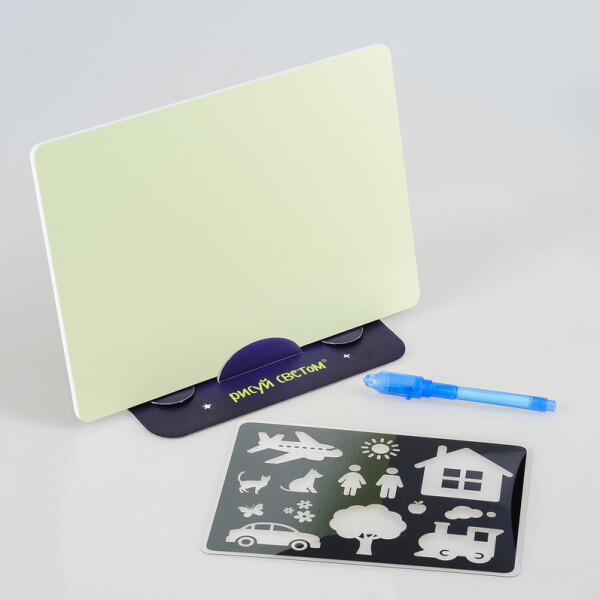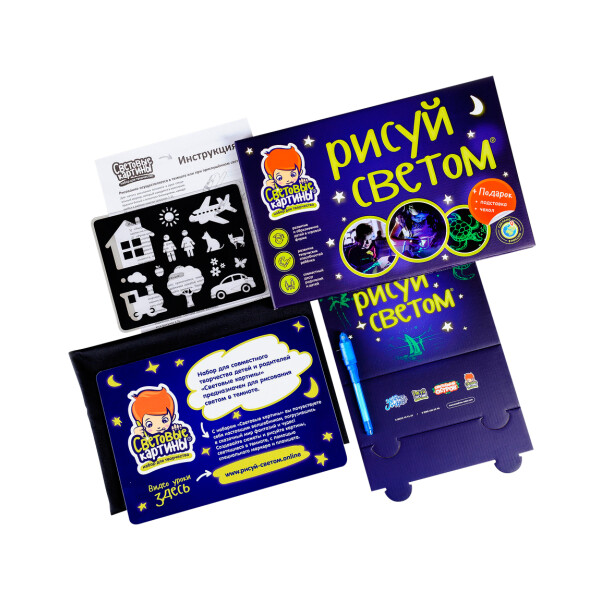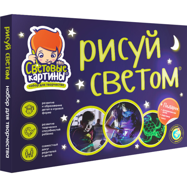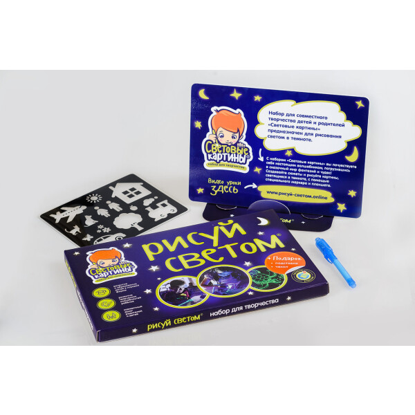 С набором «Световые картины» вы почувствуете себя настоящим волшебником, погрузившись в сказочный мир фантазий и чудес! Создавайте сюжеты и рисуйте картины, светящиеся в темноте, с помощью специального маркера и планшета.
