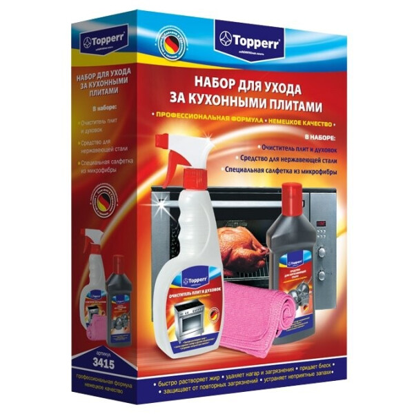 В наборе для ухода за кухонными плитами Topperr 3415 3 предмета: средство для чистки плит, духовок и грилей, 500 мл (предназначено для быстрого удаления нагара, масложировых и других загрязнений. Легко растворяет жир и стойкие загрязнения. Устраняет неприятные запахи и придаёт блеск очищаемой поверхности)