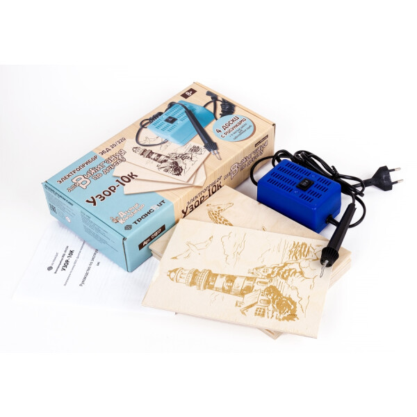Представляем вашему вниманию набор для выжигания по дереву «Узор-10к», с двухступенчатым режимом нагрева и комплектом из 8 досок, размером 210×150 мм, что делает его идеальным для занятий на уроках труда, в кружках детского творчества и для занятия выжиганием по дереву дома.