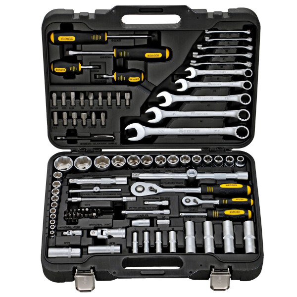 Набор "Berger" - универсальный набор инструментов для ремонта и обслуживания автомобилей. Комплект подойдет для использования как профессионалами в автомастерских, так и водителями в гараже или в дороге. Инструменты выполнены из хромованадиевой стали. Кейс из пластика компактно вмещает в себя 95 предметов набора, обладает ручкой для транспортировки и защелками.