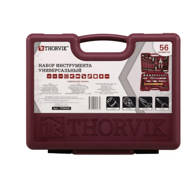 Универсальный набор инструмента THORVIK UTS0056 56 предметов подходит как для использования в быту, так и в профессиональных авторемонтных мастерских. Рабочие части изделий сделаны из качественной хромованадиевой стали, что гарантирует прочность и долгий срок службы. Инструменты оснащены двухкомпонентными рукоятками, которые не скользят в руке и обеспечивают крепкий захват. Пластиковый кейс упрощает хранение и транспортировку набора.