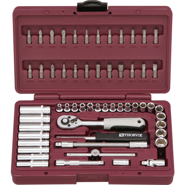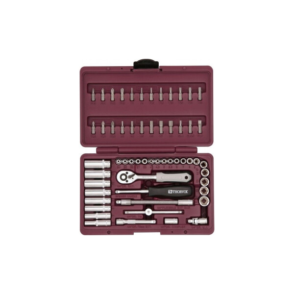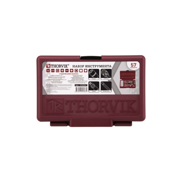 Набор инструмента THORVIK UTS0057 57 предметов 52058 пригодится для работы в автосервисе или шиномонтажной мастерской. Все изделия изготовлены из хромованадиевой стали, благодаря чему отличаются прочностью и долговечностью. Двухкомпонентные рукоятки не скользят в руке, что обеспечивает крепкий захват. Набор состоит из 57 предметов, надежно укомплектованных в пластиковый кейс.