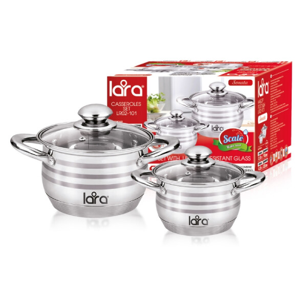 Данный набор посуды имеет многослойное термоаккумулирующее, капсулированное дно, крышку из жаропрочного стекла и удобные ручки из высококачественной стали.