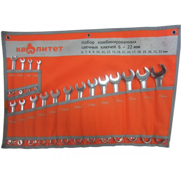 Ключи изготовлены из прочной хромованадиевой стали с хромоникелевым защитным покрытием, придающим изделию прочность и предохраняющим его от коррозии. Набор комбинированных гаечных ключей (6, 7, 8, 9, 10, 11, 12, 13, 14, 15, 16, 17, 18, 19, 20, 21, 22 мм) в текстильном держателе.