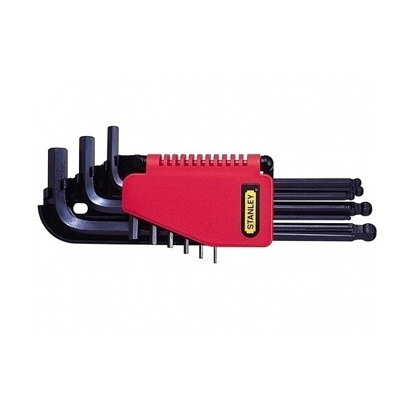 Набор шестигранных ключей Stanley 0-69-256 состоит из девяти предметов. Все они изготовлены из высокопрочной стали. На конце каждого ключа расположен шар, который позволяет работать под углом к оси крепежных элементов, расположенных в труднодоступных местах. Ключи уложены в специальный маркированный футляр для удобства хранения и транспортировки.