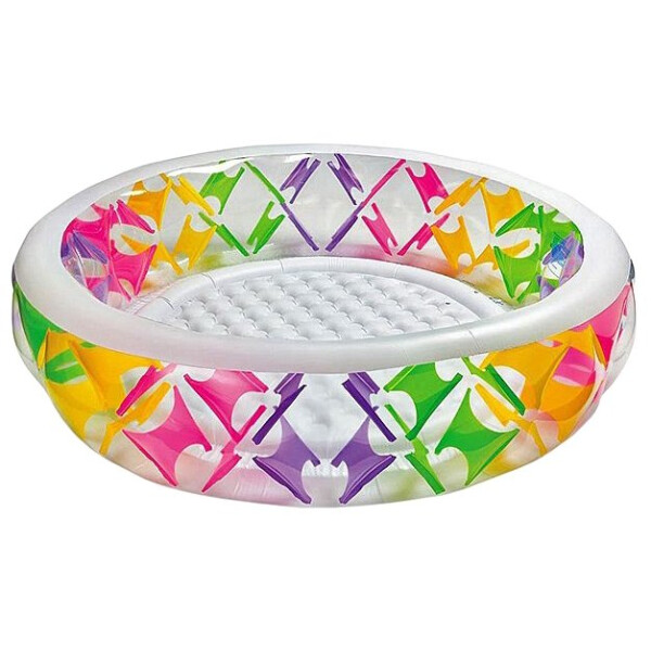 Большой круглый бассейн с надувным полом и широкими прозрачными стенками. Бассейн достаточно большой, в нем с комфортом поместится несколько человек.
