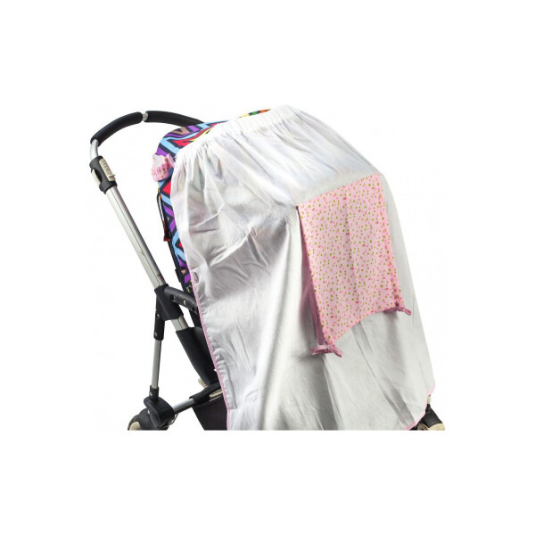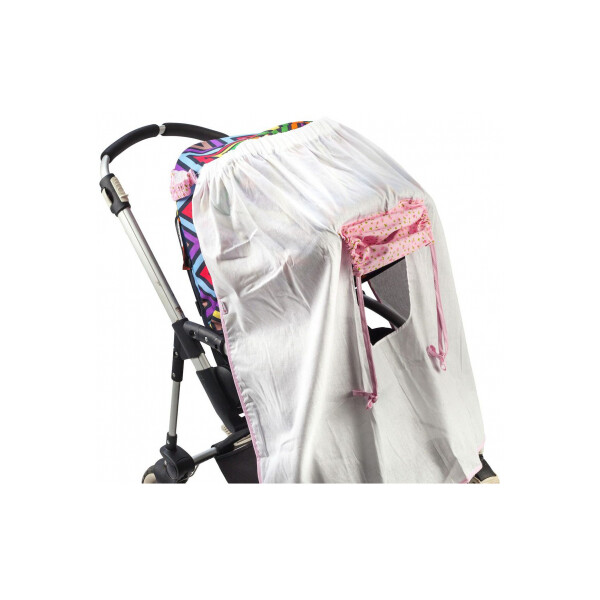 Накидка от солнца Mammie является незаменимым аксессуаром для коляски ранней осенью, поздней весной и в солнечные летние дни. Изделие выполнено из тончайшего марлевого хлопка, который прекрасно вентилируется, не препятствует воздухообмену внутри коляски и предохраняет ребенка от прямых солнечных лучей. Натуральный материал надежно защищает от солнца, насекомых и тополиного пуха. Белая накидка оснащена маленьким окошком со шторкой из розового текстиля, высота которой фиксируется благодаря завязкам. Накидка легко крепится сзади вокруг капюшона и подходит для всех видов колясок и автокресел.