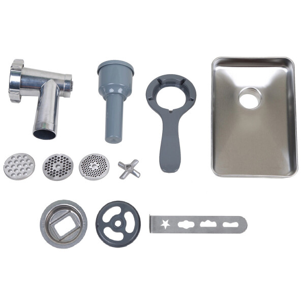 Комплект аксессуаров (мясорубка) к комбайну CASO KM 1200. Принадлежности: решетки 3 мм, 5 мм и 8 мм, насадка для колбас, насадка для печенья, загрузочный поддон, толкатель.