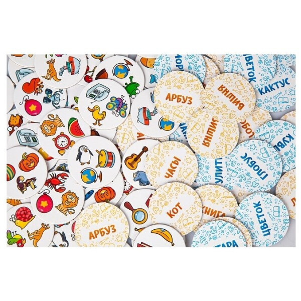 В игровом комплекте 96 фишек-жетонов. С одной стороны фишки находятся три яркие картинки, с другой написано слово. Фишки разделены цветом на два игровых комплекта: в первом, оранжевом, слова покороче, в синем - подлиннее.