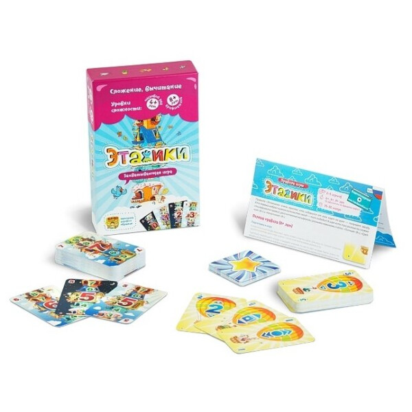 Игра в "Этажики" настолько сильно увлечет ребенка, что ему будет сложно от нее оторваться. Яркие карточки с цифрами и воздушными шарами помогут ребенку быстро выучится сложению и вычитанию. В зависимости от возраста участников, играть можно в разные уровни сложности.