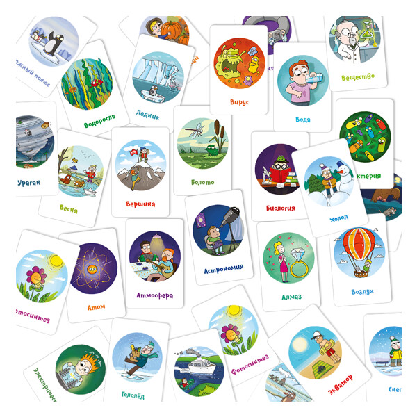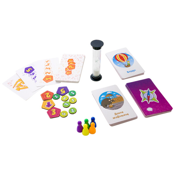 Комплект: 158 карт с терминами, 17 карт-указателей, 5 игровых фишек, 5 жетонов-пятиугольников с номерами, 1 жетон-указатель со стрелкой, 30 круглых жетонов для подсчета очков, песочные часы (30 сек).