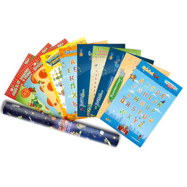 В состав набора входят 10 ярких красочных плакатов, охватывающих различные области знаний, таких как математика, геометрия, логика, русский и английский язык. Обучающие плакаты – это настоящие настенные репетиторы. Информация на них представлена ярко, наглядно и красочно. Ребенок сможет ознакомиться с уникальной методикой по изучению таблицы умножения, долей, дробей, геометрических фигур. Плакаты с алфавитами помогут в запоминании русских и английских букв.