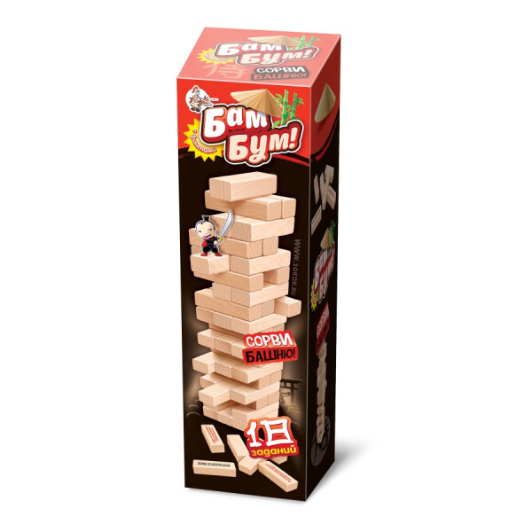 «Падающая башня» стала еще более азартной и «безбашенной». На каждом третьем бруске этого варианта игры написано веселое задание! Фанты нанесены специальной краской, никакие пленки наклеивать не надо, открываем коробку и играем. Краска безопасна, долговечна и износостойка. Брусочки, по-прежнему, ничем не покрыты, изготовлены из массива сухой вятской березы. Наличие надписи никак не отражается на игровых свойствах, все они скользят одинаково. В состав игры входит специальный уголок. С его помощью надо собрать башню. В башне будет 18 рядов по три брусочка. В соседних рядах брусочки при этом должны лежать перпендикулярно друг другу. Затем надо перевернуть башню и поставить ее на стол. Уголок не даст башне рассыпаться или изменить форму. Можно убирать уголок и приступать к игре. Правила игроки могут устанавливать самостоятельно, но традиционно вытаскивают брусочки по очереди, причем одной рукой. Эти бруски выкладываются сверху теми, кто их вытащил параллельно друг другу в ряду и перпендикулярно нижнему ряду. В ряду может быть не три, а два или даже один брусок. Проигрывает тот, кто разрушит башню. Веселья прибавит наличие заданий на брусочках. Тут многим придется выбирать — либо стать на две минуты голодным муравьедом, либо вытаскивать другой более «трудный» брусок.