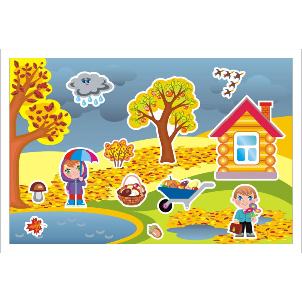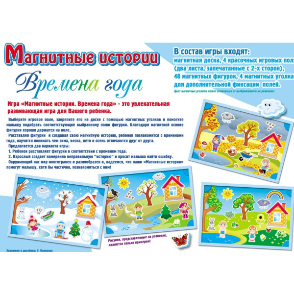 Предлагается два варианта игры: ребенок расставляет фигурки в соответствии с временем года; взрослый создает намеренно неправильную "историю" и просит малыша найти ошибку.