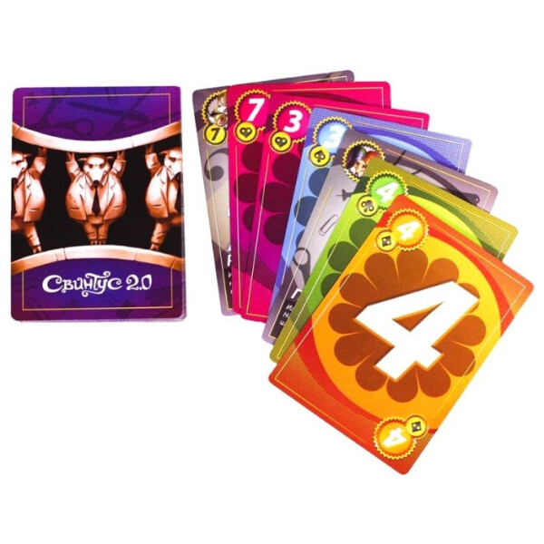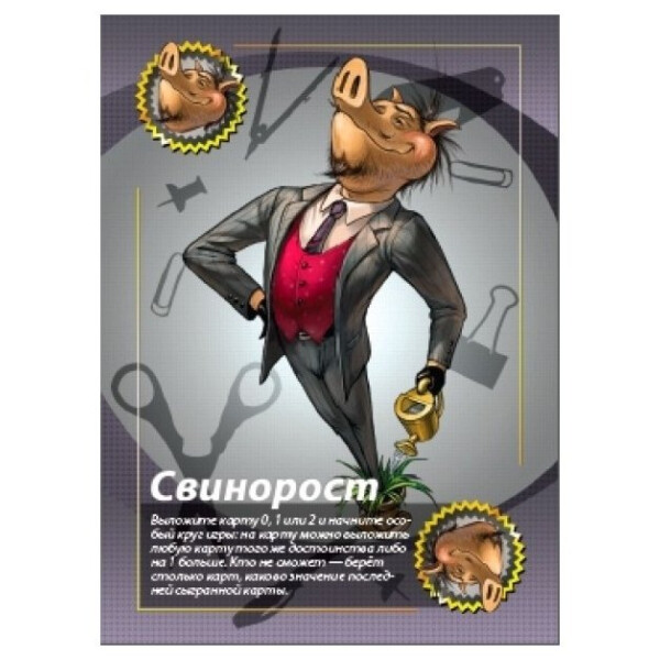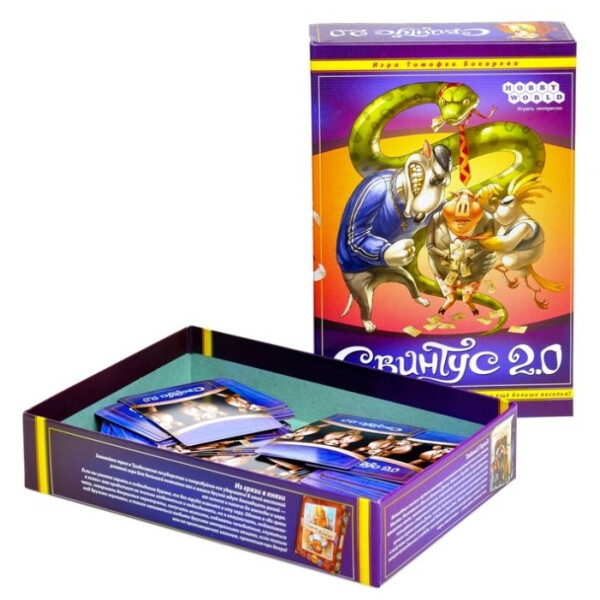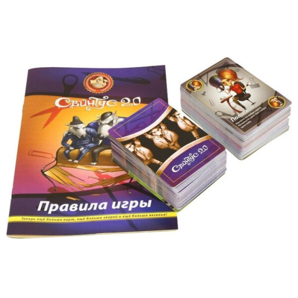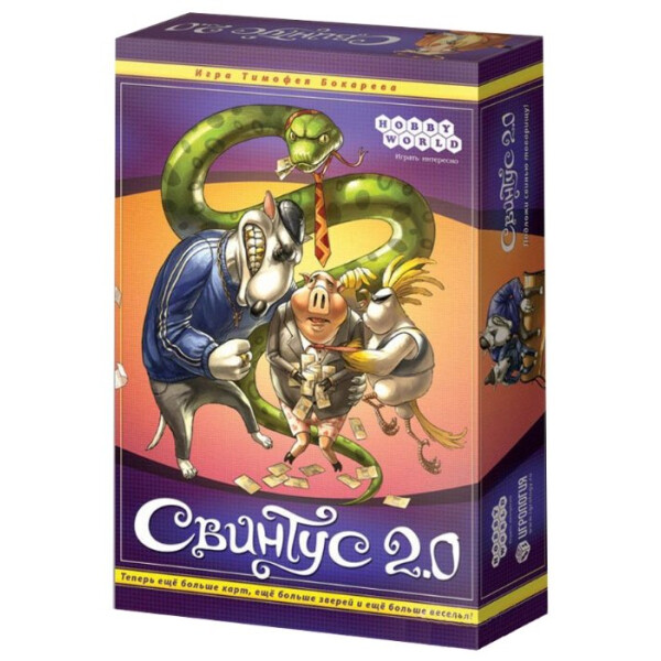 Настольная игра "Свинтус 2.0" добавляет в игру еще больше карт, еще больше животных и еще больше веселья. На помощь классическим свиньям пришли чопорные змеи, гламурные попугаи и задиристые собаки. С помощью этих карт вы сможете составить свою неповторимую игровую колоду, идеально подходящую именно для вашей компании.Цель игры осталась прежней - избавиться от всех своих карт. А средств достижения победы хоть отбавляй: заморочьте голову противника Предписаниями, заставьте его подчиняться правилам Этикета, сломите его Вызовом на карточную дуэль и поглумитесь в назидание при помощи карт Куража.