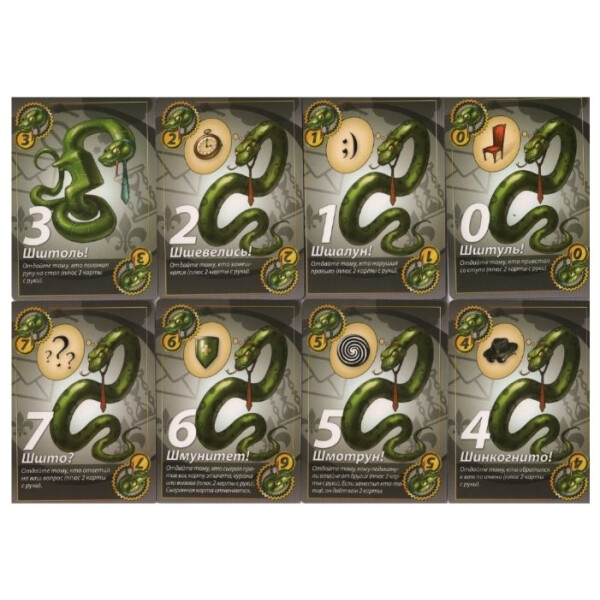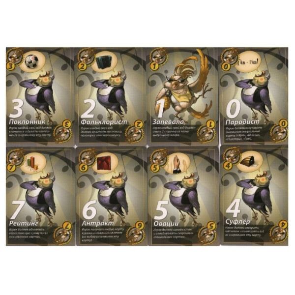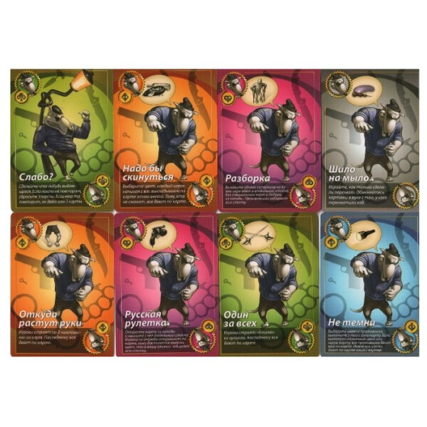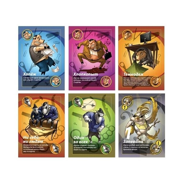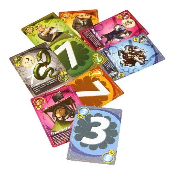 Комплект включает 64 цифровые карты, 60 карт предписаний "Свинская бюрократия", 22 карты вызова "Собачья задиристость", 16 карт куража "Попугайский шоу-бизнес", 18 карт этикета "Змеиная чопорность", 12 пустых карт и подробные правила игры на русском языке