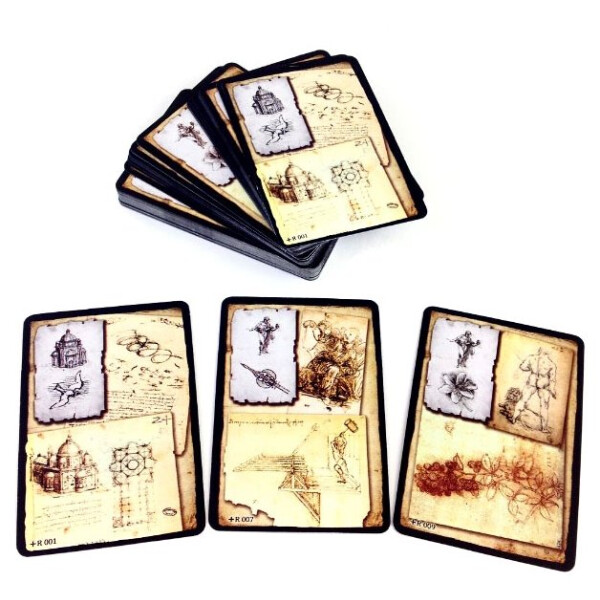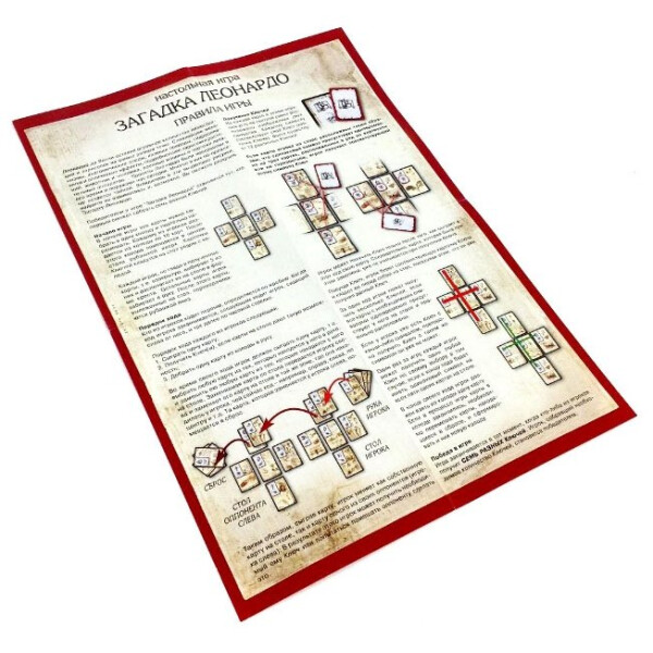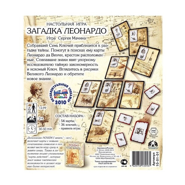 Базовый игровой набор "Загадка Леонардо" от ведущего разработчика игр компании-издательства "Правильные игры" Сергея Мачина будет интересен и детям, и взрослым. Настольная игра состоит из 54 карт и 36 ключей. Игра несложная, здесь нет необходимости в разработке стратегии, достаточно весомых тактических решений. Изюминкой набора стали карты с фрагментами записей из дневника Леонардо да Винчи, чьи загадки до сих пор волнуют умы человечества.