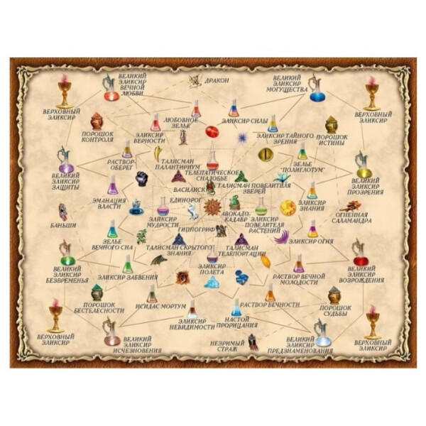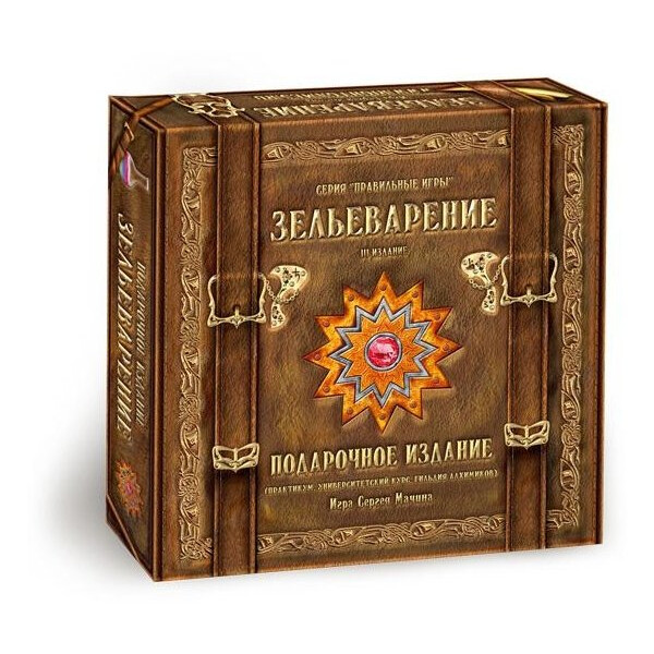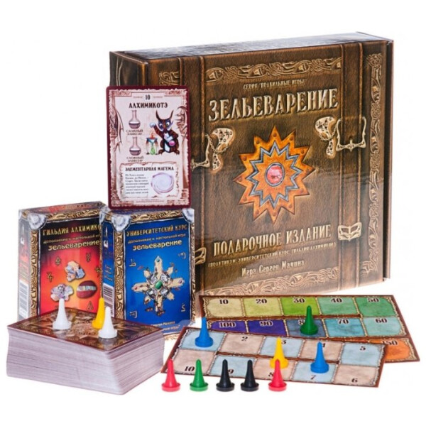 «Зельеварение» — одна из самых популярных настольных игр. Она представляет собой симулятор алхимии: с помощью особых карт, на которых указаны рецепты магических субстанций и их составляющие, игроки создают всевозможные зелья, эликсиры и талисманы, получая победные очки за проведённые опыты. Чем сложнее собранный рецепт, тем больше очков он приносит. Например, из волн эфира и пера феникса можно сделать «двухочковый» раствор вечной молодости; если смешать его с эликсиром огня, то получится великий эликсир возрождения ценностью шесть очков; а два любых великих эликсира объединяются в верховный эликсир — а это десять баллов, серьёзная заявка на победу. В подарочное издание «Зельеварения» вошли все три выпуска игры: «Практикум», «Университетский курс» и«Гильдия алхимиков». Таким образом, этот набор позволяет сыграть в «Зельеварение» как «базовым составом», так и с добавлением первого, второго или сразу обоих дополнений. Кроме того, в коробке вы найдёте бонусные материалы, отсутствующие в обычных изданиях игры: карту существа «Алхимикотэ» и альтернативные последовательности создания философского камня для «Гильдии алхимиков». Подарочное издание «Зельеварения» отлично подойдёт тем, кто познакомился с этой настолкой у друзей или на игротеке и теперь желает приобрести полную коллекцию игры. Кроме того, в полном соответствии со своим названием, эта коробка станет хорошим подарком и начинающим любителям настольных игр, и поклонникам фэнтези, и просто всем, кому хочется добавить в свою жизнь немного волшебства.