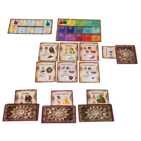Комплект карт (76 шт.), 8 фишек игроков, счетчик очков, правила игры на русском языке, учебная партия,