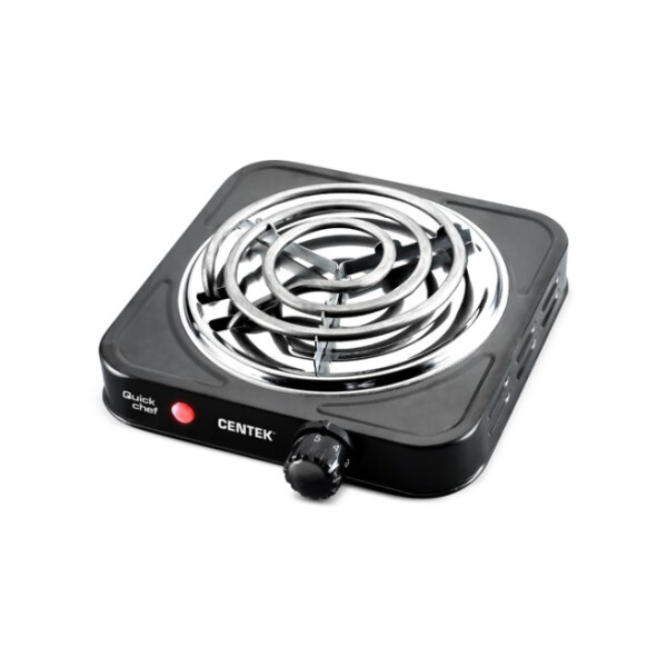 При загрязнении такую плитку очень удобно и легко мыть. Наличие индикатора включения позволит визуально контролировать рабочее состояние плитки. У плитки электрической Centek CT-1508 всего одна конфорка спиралевидной формы. Она выполнена из нержавеющей стали и довольно быстро нагревается, что способствует более быстрому процессу подогрева или приготовления еды. Диаметр конфорки – 140 мм. Поэтому вы сможете использовать для готовки небольшие кастрюльки или ковшики. Чтобы легко очистить конфорку от убежавшей и пригоревшей пищи, достаточно ее просто откинуть вверх и протереть поверхность под ней.