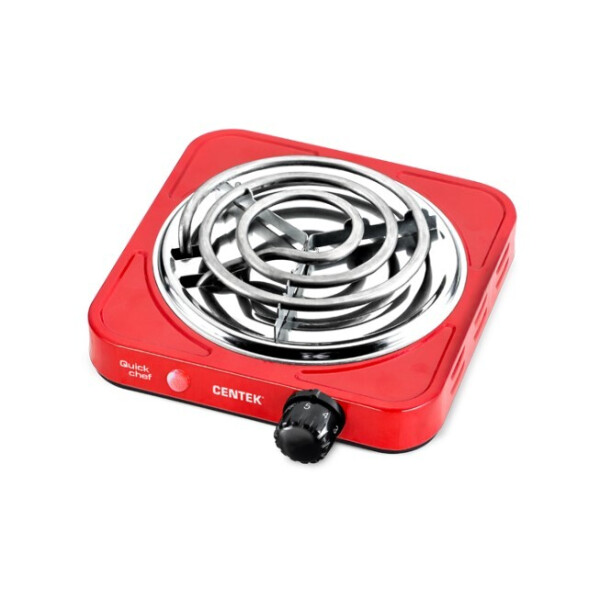 При загрязнении такую плитку очень удобно и легко мыть. Наличие индикатора включения позволит визуально контролировать рабочее состояние плитки. У плитки электрической Centek CT-1508 всего одна конфорка спиралевидной формы. Она выполнена из нержавеющей стали и довольно быстро нагревается, что способствует более быстрому процессу подогрева или приготовления еды. Диаметр конфорки – 140 мм. Поэтому вы сможете использовать для готовки небольшие кастрюльки или ковшики. Чтобы легко очистить конфорку от убежавшей и пригоревшей пищи, достаточно ее просто откинуть вверх и протереть поверхность под ней.