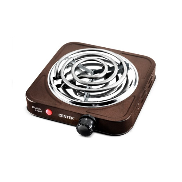 При загрязнении такую плитку очень удобно и легко мыть. Наличие индикатора включения позволит визуально контролировать рабочее состояние плитки. У плитки электрической Centek CT-1508 всего одна конфорка спиралевидной формы. Она выполнена из нержавеющей стали и довольно быстро нагревается, что способствует более быстрому процессу подогрева или приготовления еды. Диаметр конфорки – 140 мм. Поэтому вы сможете использовать для готовки небольшие кастрюльки или ковшики. Чтобы легко очистить конфорку от убежавшей и пригоревшей пищи, достаточно ее просто откинуть вверх и протереть поверхность под ней.