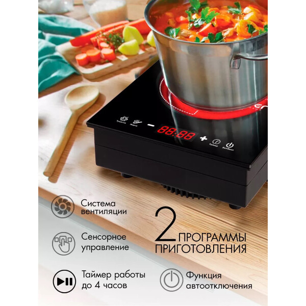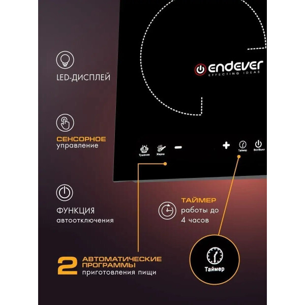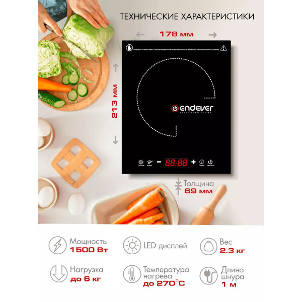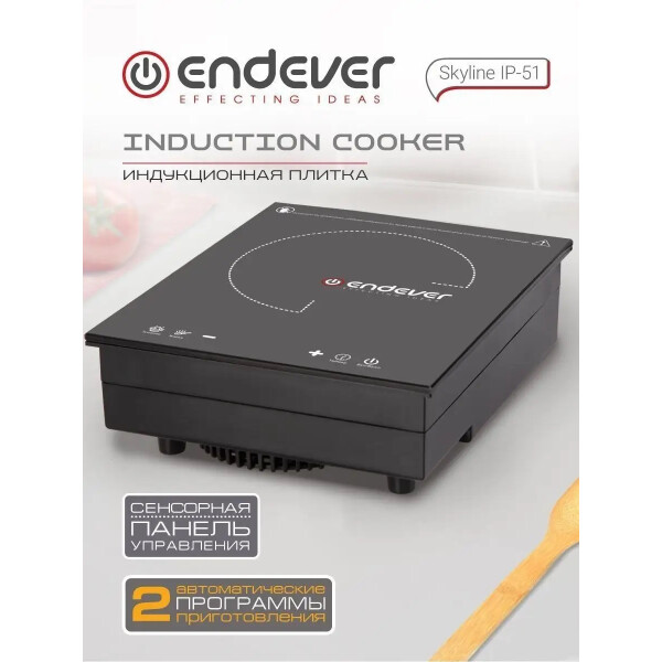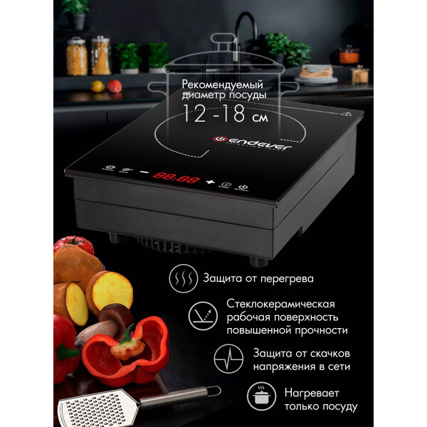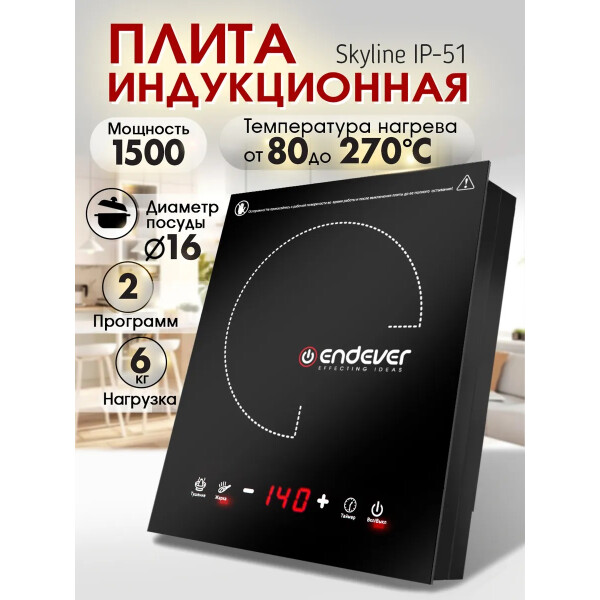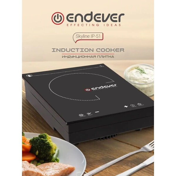 Индукционное устройство Endever SkyLine IP-51 обладает 11.5-киловаттной максимальной мощностью. Поверхность плитки изготовлена из стеклокерамического материала, что упрощает ее очищение. Это обусловлено тем, что модель лишена выступающих элементов и пазов, в которые может забиться грязь. Конструкция прибора предусматривает наличие всего одного места для приготовления пищи. Выбор режима приготовления осуществляется при помощи сенсорных переключателей. О безопасном использовании аппарата позаботится опция защитного отключения. Имеется таймер.