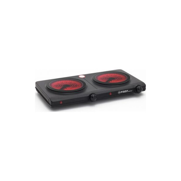Корпус электроплиты First FA 5096-2 сделан из нержавеющей стали, покрытой черной матовой краской, в нижней части корпуса расположены прорезиненные ножки, придающие плите устойчивое положение при работе. На передней части корпуса размещены световой индикатор питания и механический, поворотный регулятор термостата.