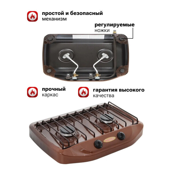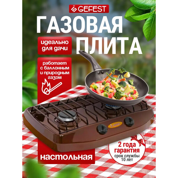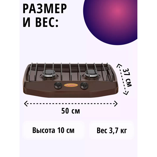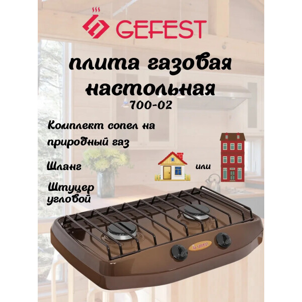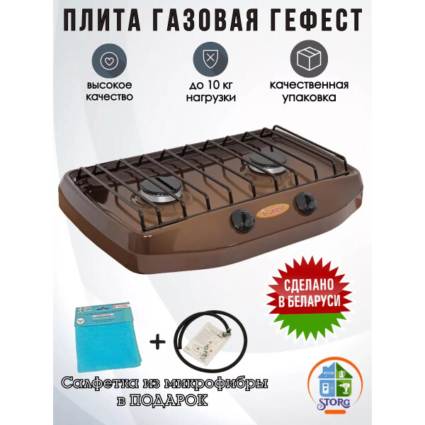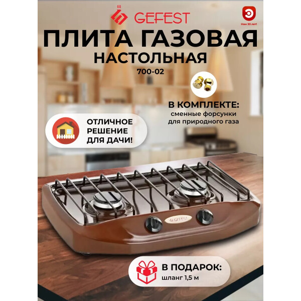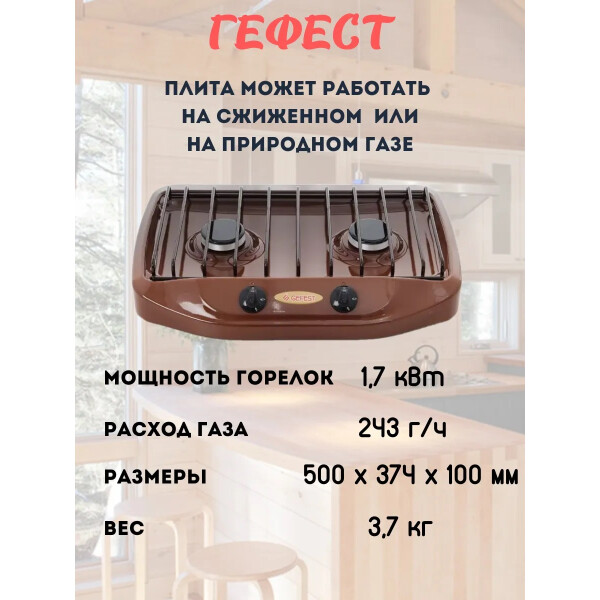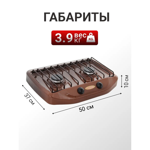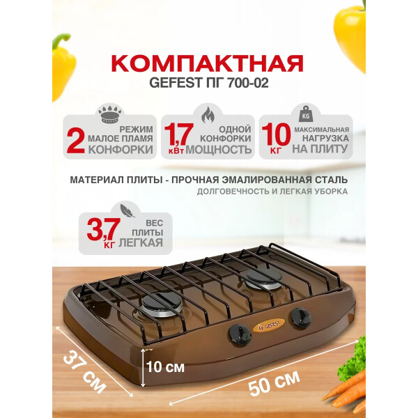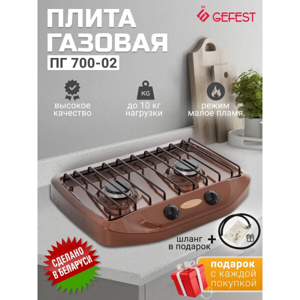Газовая настольная плитка Гефест 700-02 подойдет для загородного участка или небольшой квартиры. Она не займет много места, габариты этой модели равны 52.1x38x9.2 см. Поверхность плитки изготовлена из эмалированной стали, оформленной в коричневом цвете. Она прослужит долго, легко моется и неприхотлива в уходе.