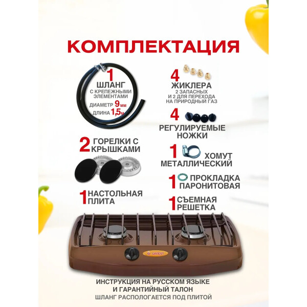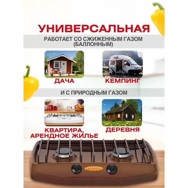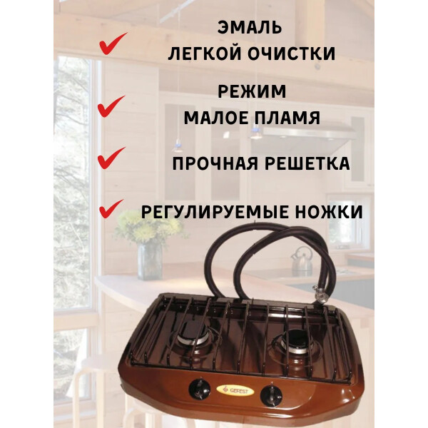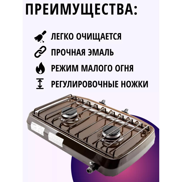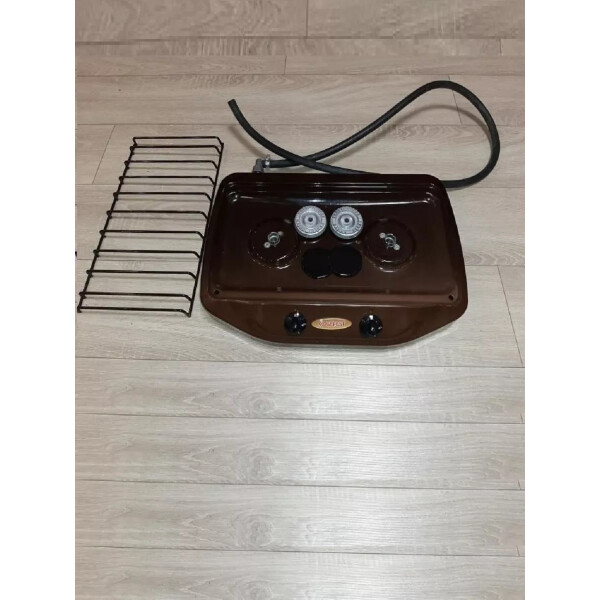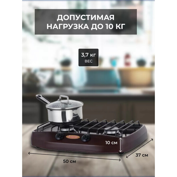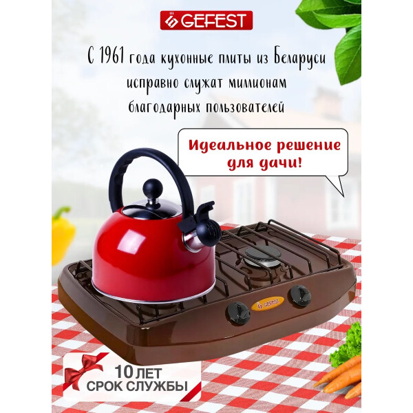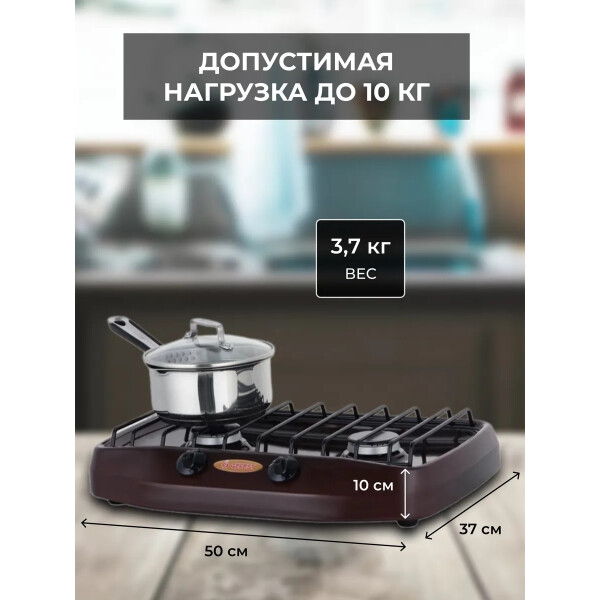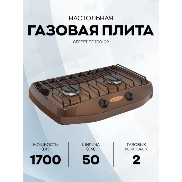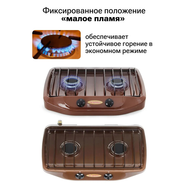 Газовая настольная плитка Гефест 700-02 подойдет для загородного участка или небольшой квартиры. Она не займет много места, габариты этой модели равны 52.1x38x9.2 см. Поверхность плитки изготовлена из эмалированной стали, оформленной в коричневом цвете. Она прослужит долго, легко моется и неприхотлива в уходе.