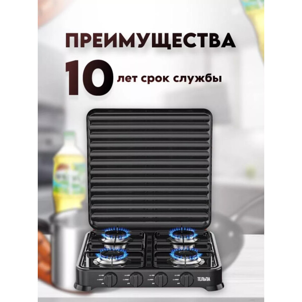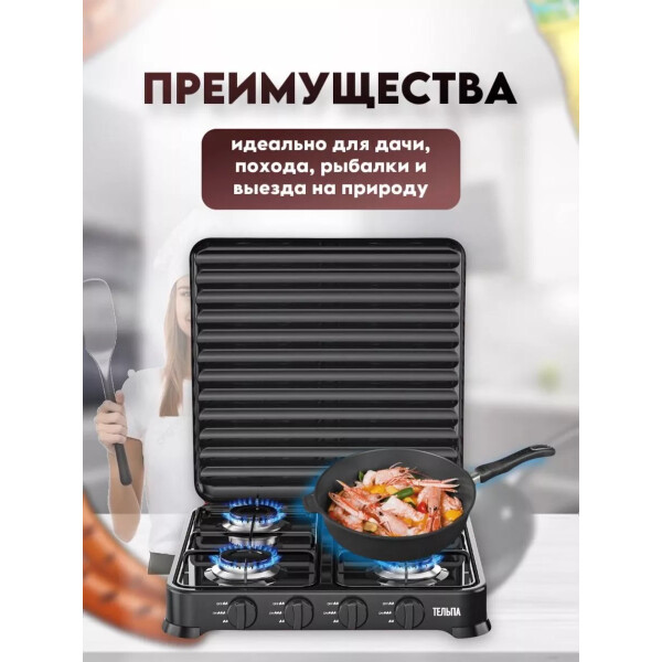 Полноценная газовая плита для дачи на 4 конфорки. Легко и просто установить на большой стол или столешницу. Для подключения к газовому баллону требуется редуктор, шланг и хомут. Две съемные решетки под которыми удобно мыть и вытирать плиту. Не маркое устойчивое к истиранию покрытие. Алюминиевые конфорки надежны и долговечны.