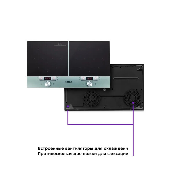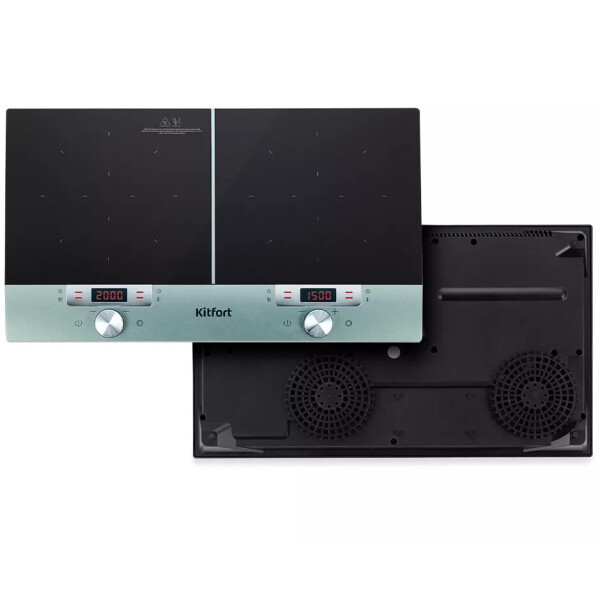 На обратной стороне плиты встроены два вентилятора, которые способствуют быстрому охлаждению устройства во время интенсивной работы и после её завершения. Плита оборудована противоскользящими ножками, придающими ей устойчивое положение на поверхности.