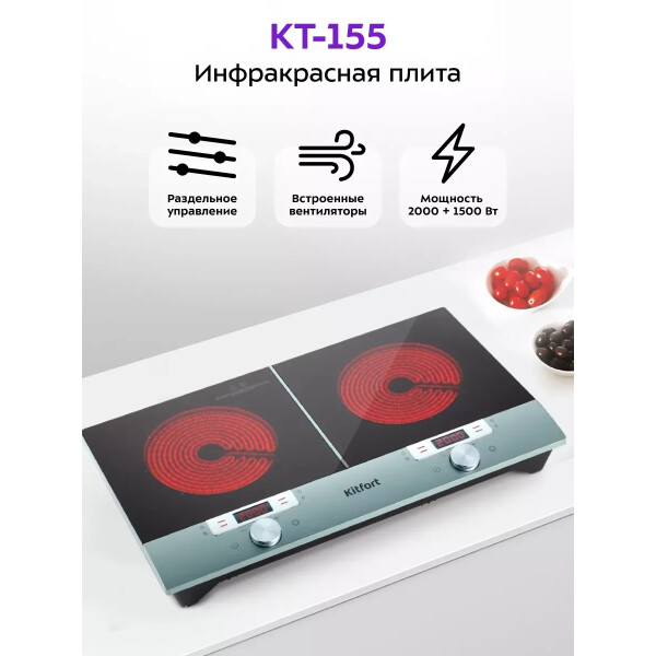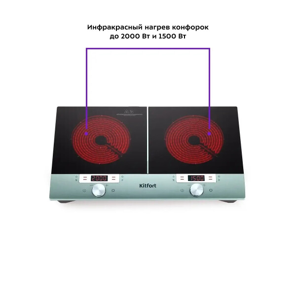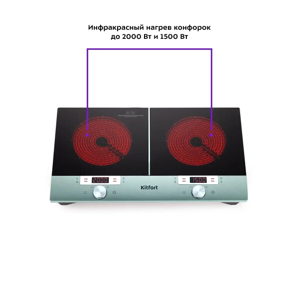 Создана для кулинарных шедевров!Инфракрасная плита Kitfort предназначена для приготовления ваших любимых блюд вкусно и очень быстро! Плита выполнена в пластиковом корпусе с рабочей поверхностью из стеклокерамики, а мощность конфорок достигает 1500 Вт и 2000 Вт соответственно!