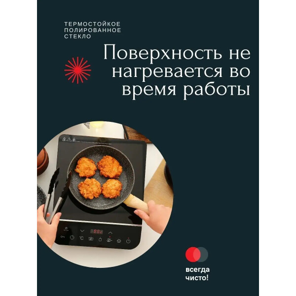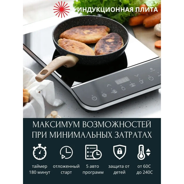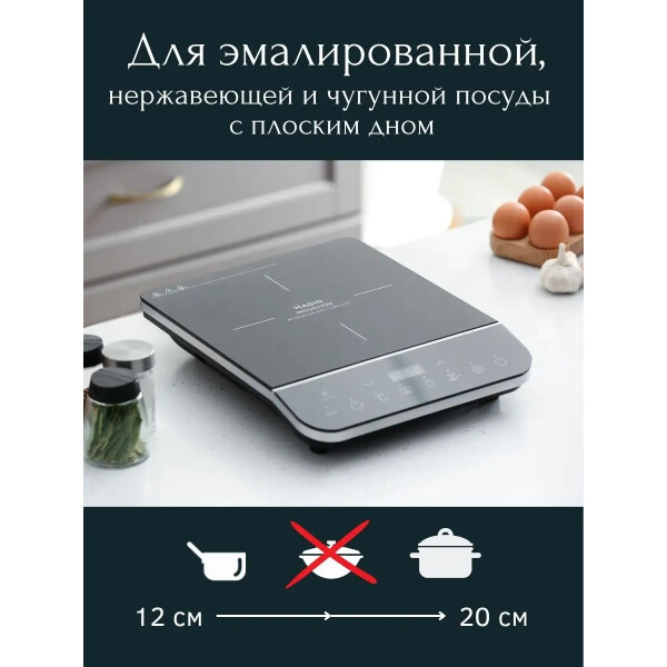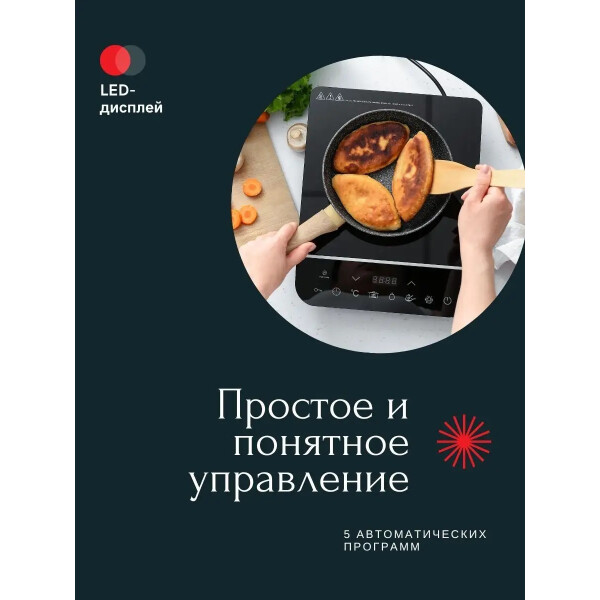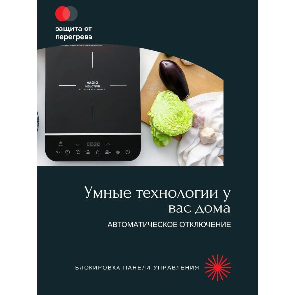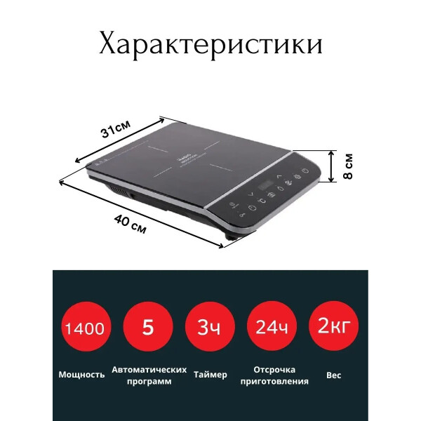Индукционная компактная кухонная плита Magio MG-447 обеспечит высокий уровень удобства и комфорта благодаря сенсорному управлению с цифровым дисплеем. При приготовлении пищи Вы можете воспользоваться одной из пяти встроенных программ, которые позволяют быстро приготовить вкусную еду благодаря индивидуальному подходу к процессу приготовления конкретного блюда. В данной настольной плите используются современные технологии, позволяющие готовить не только вкусно и быстро, но и абсолютно безопасно. Исключает получения ожогов, так как рабочая поверхность почти не нагревается во время готовки, поэтому она не нагревает воздух в помещении во время приготовления пищи. Плитка имеет систему распознавания посуды и диаметра дна, которые обеспечивают эффективную работу. При эксплуатации такой плиты не бывает дыма, ведь пища, случайно попавшая на стеклокерамическую поверхность не пригорает. Все загрязнения легко устраняются с помощью влажной тряпки. Оснащена функцией таймера до 3 часов и отсрочкой приготовления до 24 часов, что очень удобно для молодых мам или просто занятых людей.