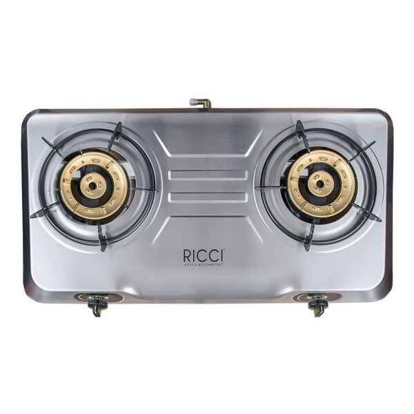 Газовая плитка Ricci RGH-702C - стильный современный бытовой прибор для приготовления пищи, очень компактный и мобильный. Он имеет две конфорки, благодаря чему владелец может одновременно готовить или разогревать два блюда или кипятить чайник. Корпус плиты изготовлен из нержавеющей стали, горелки выполнены из латуни имеют разный диаметр. Устройство работает от баллонного газа (в качестве топлива используется пропан-бутан), чтобы зажечь пламя, достаточно воспользоваться пьезоподжигом. Газовая плита RGH-702 достаточно компактна для того, чтобы использовать ее на кухне в городской квартире, на даче или во время вылазки на природу. Устройство имеет малый вес и работает исключительно на балонном газе, а не на природном (магистральном). Приспособление имеет достаточно тонкий корпус, выполненный из нержавеющей стали. Материал изготовления решеток – эмалированная сталь, конфорок – латунь. Поворотные переключатели сделаны из экологически безопасного пластика. Настольная газовая плита Ricci RGH-702C является отличным решением для условий, где нет стационарного газопровода или электричества. Модель выполнена из нержавеющей стали, имеет две горелки из латуни. Устройство оснащено механическим управлением, оно осуществляется с помощью поворотных переключателей на передней панели. Есть пьезоподжиг. Плита Ricci RGH-702C занимает мало места, на ней легко работать.