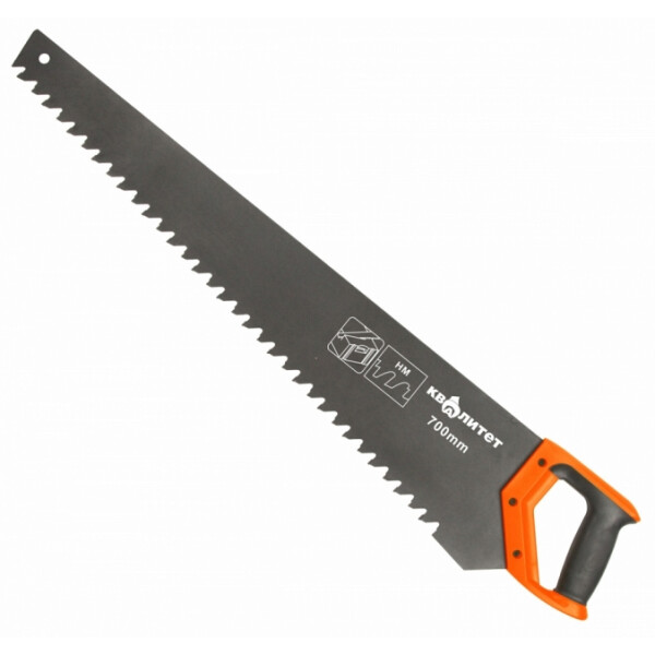 Квалитет НП-700 предназначена для быстрой распиловки пено и газобетона. Полотно длинной 700 мм покрыто защитным тефлоновым покрытием, зубья чередуются через одного: первый зуб с твердосплавной напайкой вырезает бетон, второй, без напайки, служит для отведения шлама и более точного направления реза. Ручка двухкомпонентная, прорезиненная, что исключает проскальзывание даже при использовании обледеневших рукавиц.
