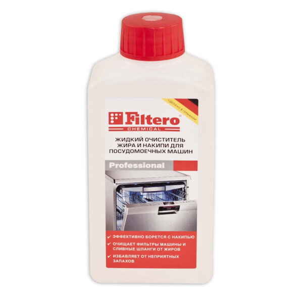 Средство для чистки посудомоечных машин Filtero 705 гарантирует эффективную очистку вашей посудомоечной машины от внутренних загрязнений, вызывающих проблемы в эксплуатации прибора. Это средство в жидком виде борется с накипью, а также удаляет с форсунок и фильтров машины жиры, являющиеся причиной неприятных запахов.