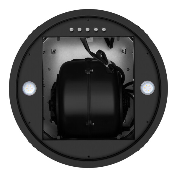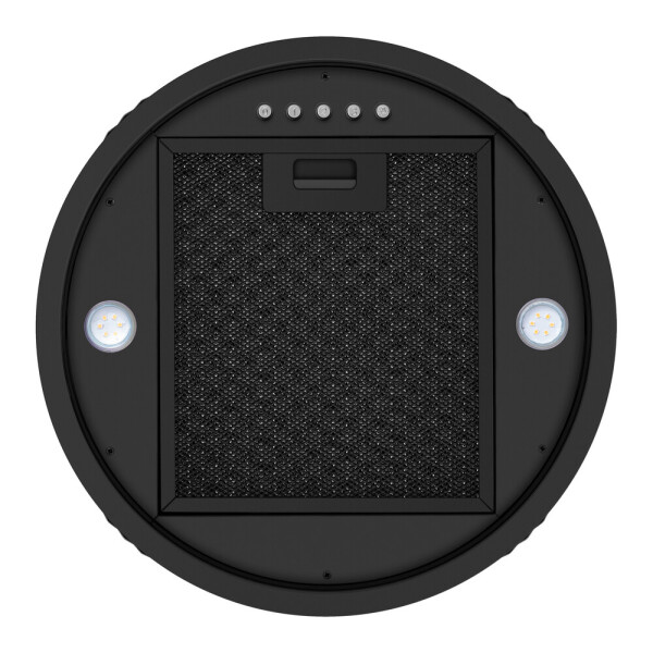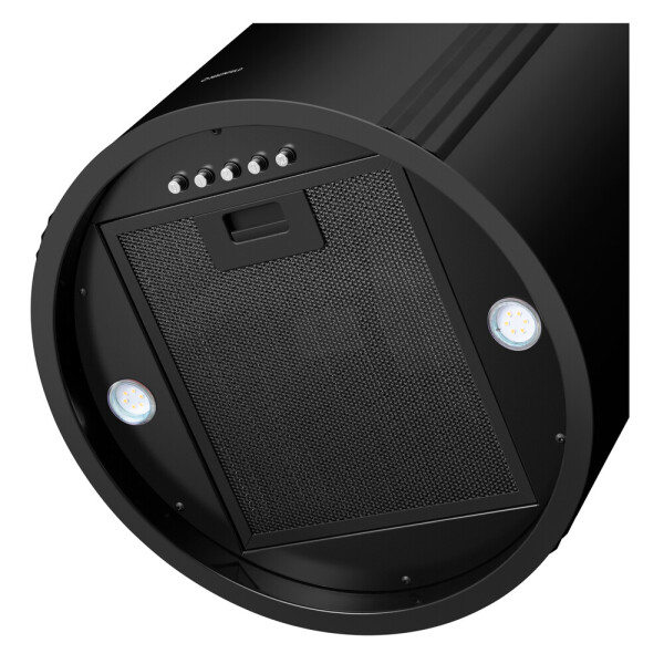 Корпус цилиндрической формы, выполненный из нержавеющей стали с термостойким покрытием, крепится на потолок над поверхностью плиты. В нижней части вытяжки находится алюминиевый многослойный жироулавливающий фильтр. Он легко вынимается и полностью разбирается, что сильно упрощает чистку.