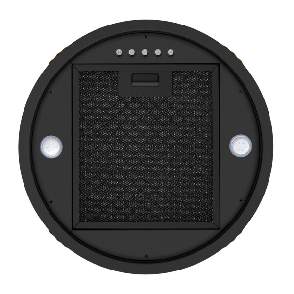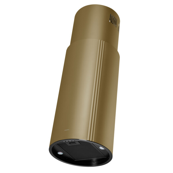 Корпус цилиндрической формы, выполненный из нержавеющей стали с термостойким покрытием, крепится на потолок над поверхностью плиты. В нижней части вытяжки находится алюминиевый многослойный жироулавливающий фильтр. Он легко вынимается и полностью разбирается, что сильно упрощает чистку.